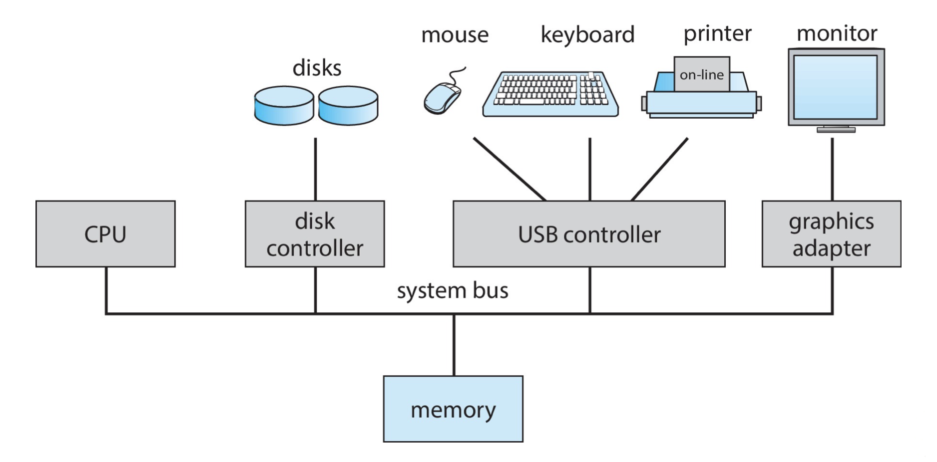 하나 이상의 CPU, 디바이스 컨트롤러는 보통 버스를 통해서 공유된 메모리에 접근한다.