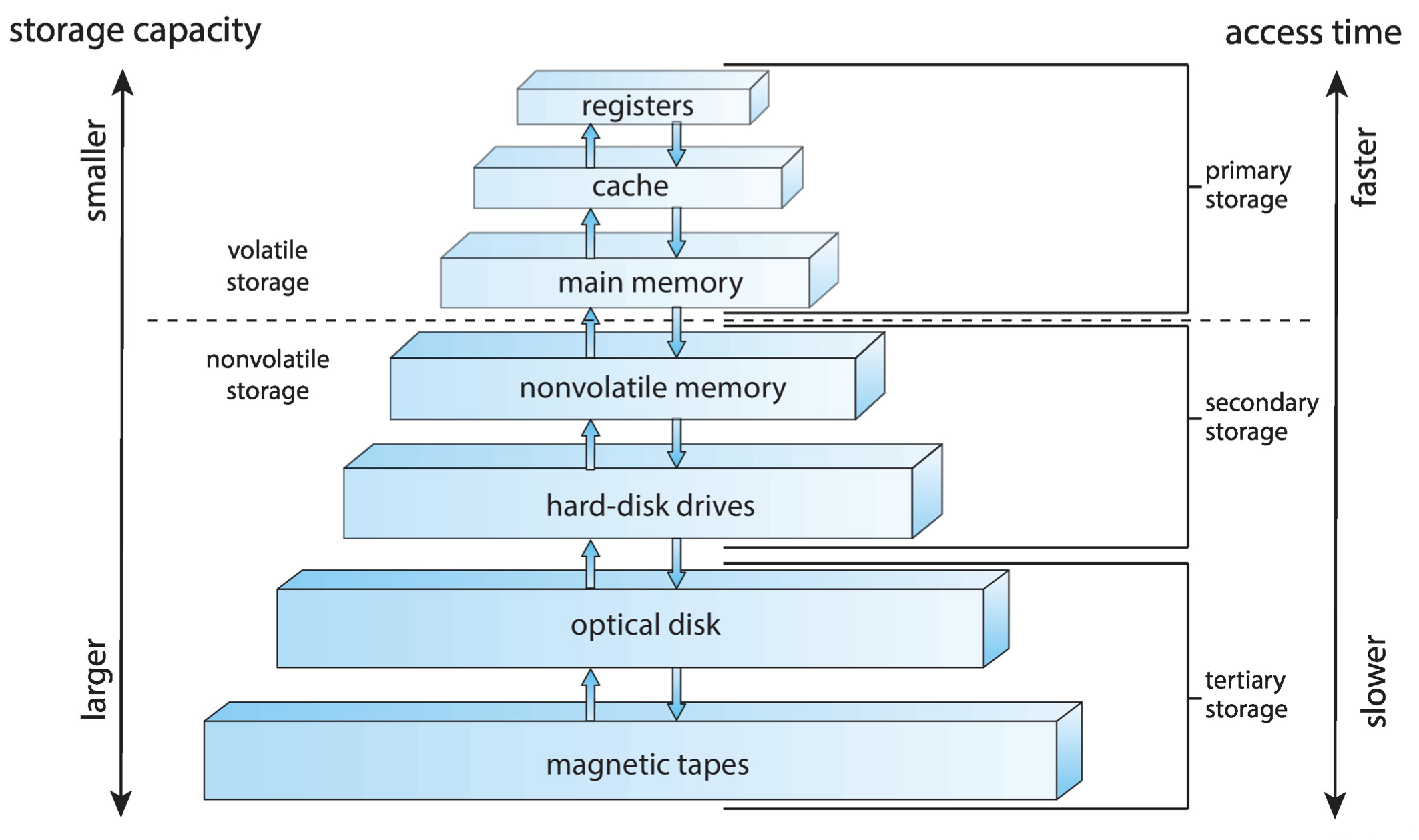 - storage system은 hierarchy(계층적)으로 이루어져 있다.