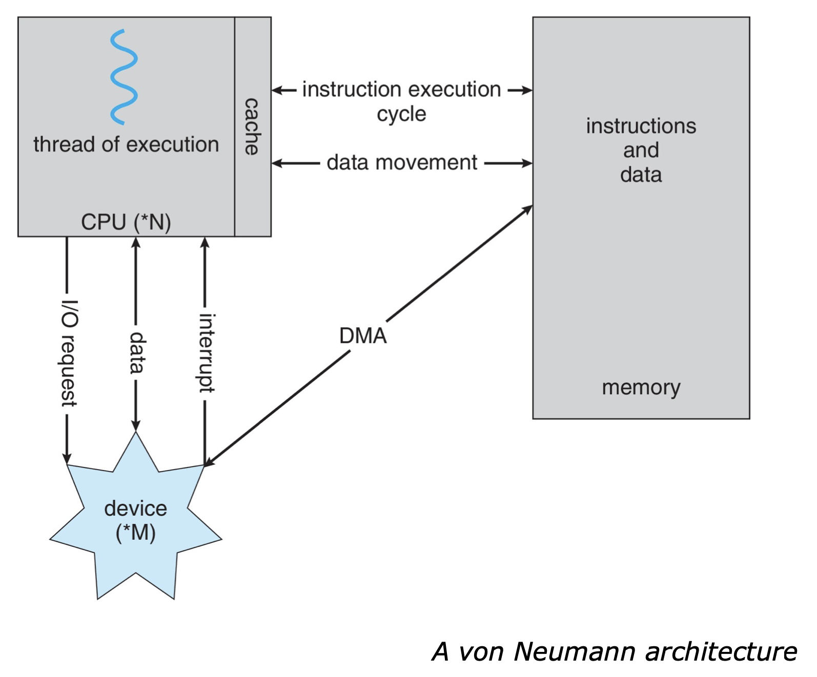 메모리와 CPU간에 데이터 이동과 명령어 실행이 이루어진다. 배운대로라면 디바이스와 메모리간의 데이터 이동이 일어날 경우, 반드시 CPU를 거쳐야 하는데, 그림을 보면 DMA를 통해서 CPU를 거치지 않고 장치와 메모리간의 데이터 이동이 이루어 진다.