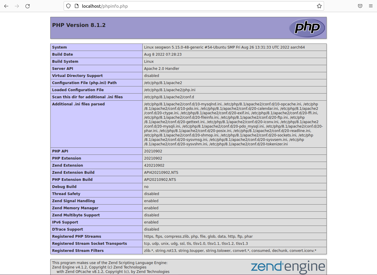 이렇게 한 후 다시 apache2 서버를 켜서 로컬호스트를 열은 다음에 방금 생성한 파일로 접근하면 (http://localhost/phpinfo.php)