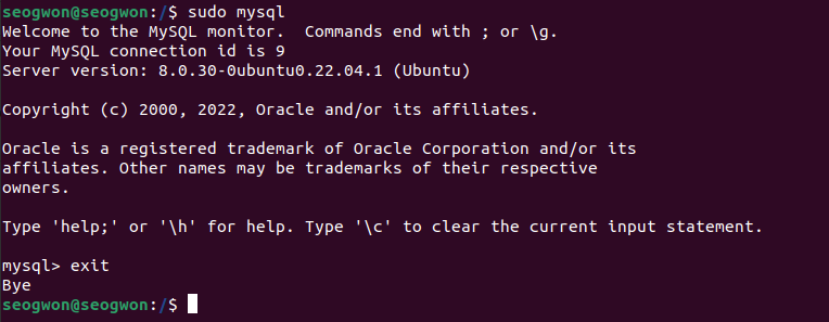 을 통해서 mysql을 실행할 수 있습니다. 커맨드로 exit를 입력하면 다시 터미널로 돌아옵니다.