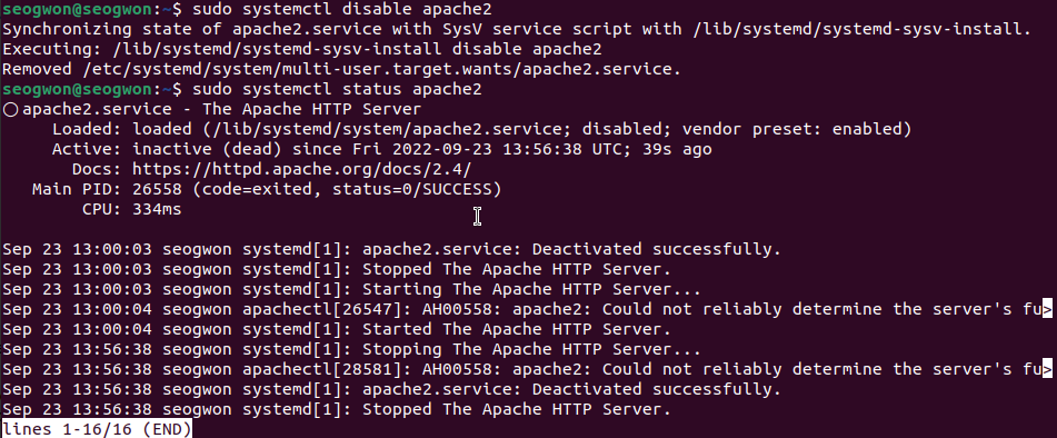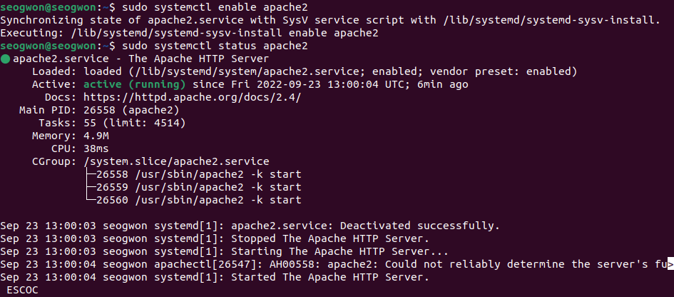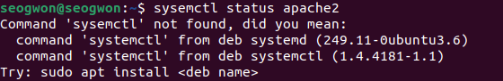 설치 후 아래 systemctl 명령어를 이용하여 인스톨이 끝난 apache2의 상태를 확인합니다.