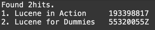 본 코드의 메인함수는 args에서 검색할 키워드를 불러온다. 쿼리를 따로 args에 String으로 지정후 실행한다면 args[0]의 길이가 0이상이기 때문에 해당 문자열을 쿼리스트링으로 사용하게 되고, 만약 따로 쿼리를 넣지 않으면 논리연산자에 의해 "lucene"이 기본 쿼리로 들어가게 된다.(그래서 그냥 실행하면 lucene으로 시작하는 문자열이 두개 나온거였구나.)